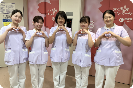 婦人科、消化器・呼吸器内科の女性専用病棟です。その他、小児外科やリプロダクションセンターも有しており、小児から高齢者までの幅広い年代の患者さんに、看護ができる病棟です。治療は、手術や内視鏡治療、化学療法などで入院する患者さんが多く、外科系も内科系も看護ができるところも特徴です。また、リプロダクションセンターでは個室対応をし、プライバシーの配慮をしています。働く看護職員は、全員女性のみでプライバシーの配慮にも気を付けて対応しています。女性専用病棟として、患者さんやご家族の要望に寄り添えるよう、温かい看護を提供できるよう努めています。