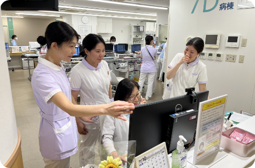 7D病棟の雰囲気は明るく、働きやすい職場です。スタッフはみんなで協力しながら、よりよい看護の提供に努めています。