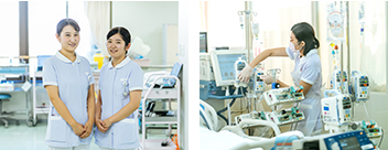 - 集中治療室は、生命の危機的状況にある重症患者さんや侵襲の大きい手術後患者さんの受け入れをしています。24時間を通じて、濃密な観察を実施し、異常の早期発見に努めています。QOLが低下することなく早期に急性期を脱することができるよう患者さんに寄りそった看護を実践しています。